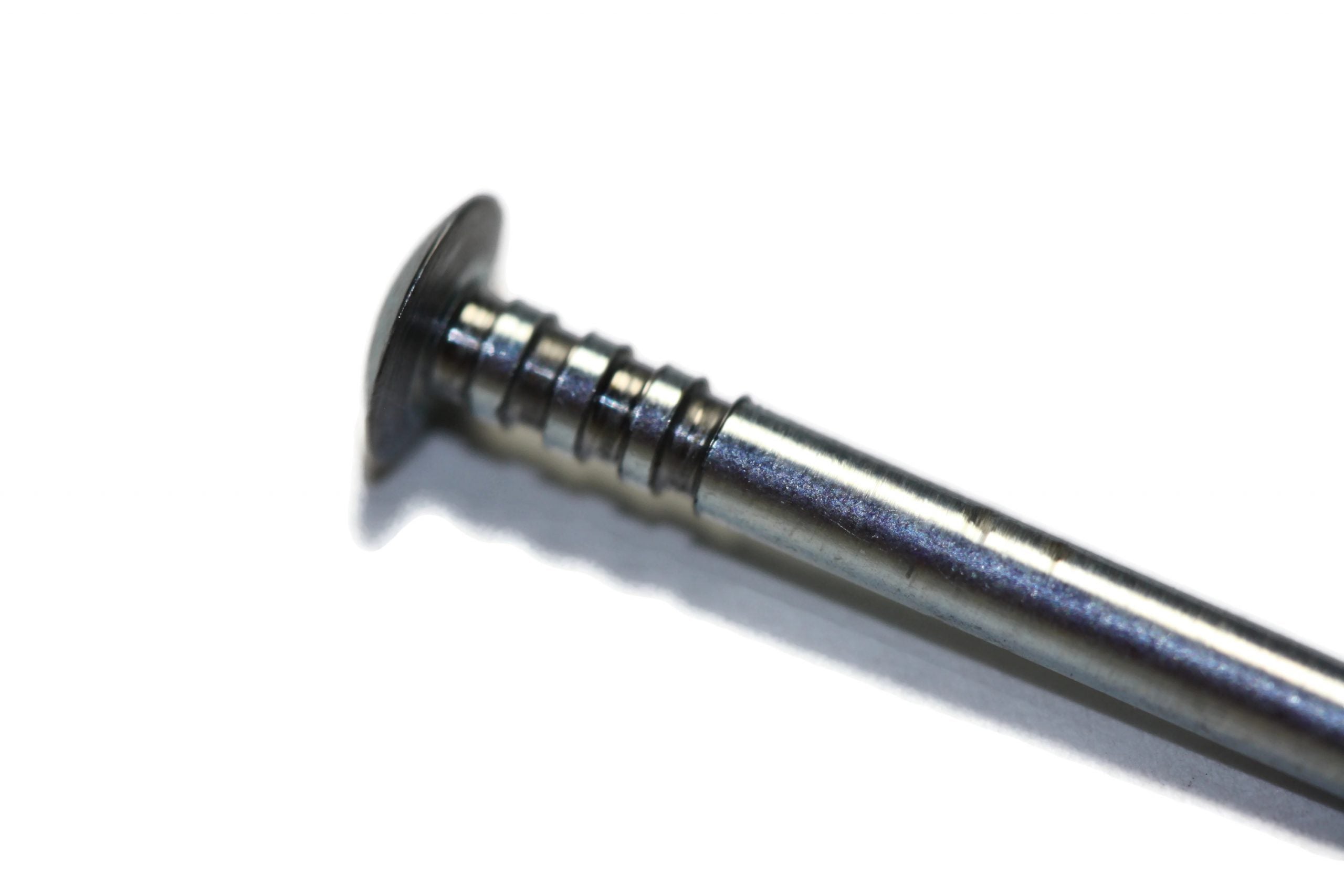 This axle starts life as an official B.S.A. Pinewood Derby axle. It is C.N.C. machined true and round, Derby Worx then adds 4 grooves (1 behind the axle head and 3 in the bore contact area) to reduce friction and hold graphite then head is back-cut for further friction reduction at the hub face on the wheel. They are semi-polished so the builder can finish it their spec.